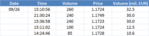 Největší obchody podle objemu na EURUSD (aktivní future kontrakt):