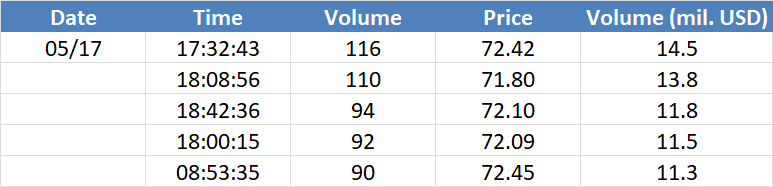 Největší obchody podle objemu na Brent (aktivní future kontrakt)