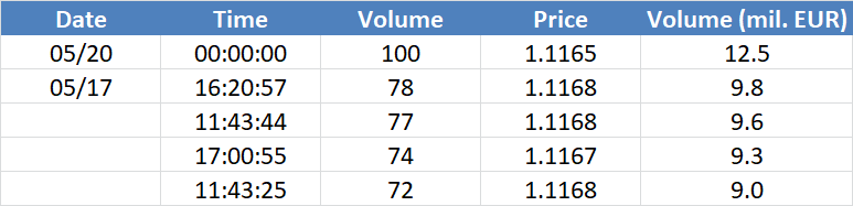 Největší obchody podle objemu na EURUSD (aktivní future kontrakt):