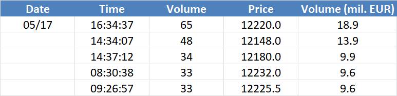 Největší obchody podle objemu na DAX (aktivní future kontrakt)