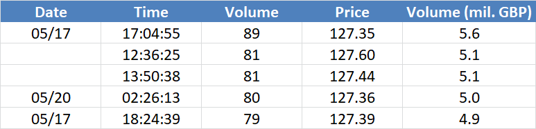 Největší obchody podle objemu na GBPUSD (aktivní future kontrakt): Největší denní objemy na trhu s měnovými futures. Na cenách, kde se včera objevily největší objemy, mohou být velcí hráči aktivní i dnes – zejména pokud se tyto ceny pohybují u některého ze včerejších high/low.