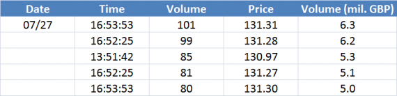 Největší obchody podle objemu na GBPUSD (aktivní future kontrakt):