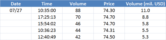 Největší obchody podle objemu na Brent (aktivní future kontrakt)