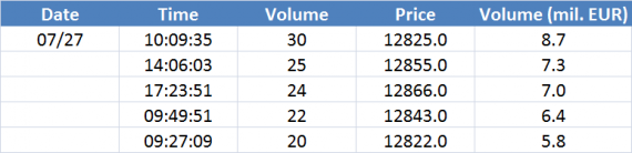 Největší obchody podle objemu na DAX (aktivní future kontrakt)