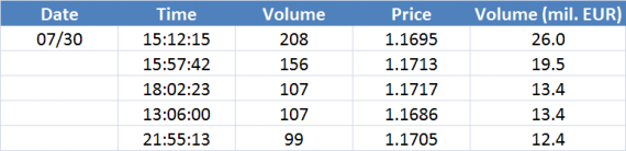 Největší obchody podle objemu na EURUSD (aktivní future kontrakt):