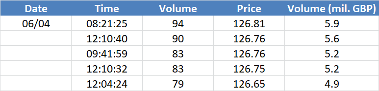 Největší obchody podle objemu na GBPUSD (aktivní future kontrakt): Největší denní objemy na trhu s měnovými futures. Na cenách, kde se včera objevily největší objemy, mohou být velcí hráči aktivní i dnes – zejména pokud se tyto ceny pohybují u některého ze včerejších high/low.