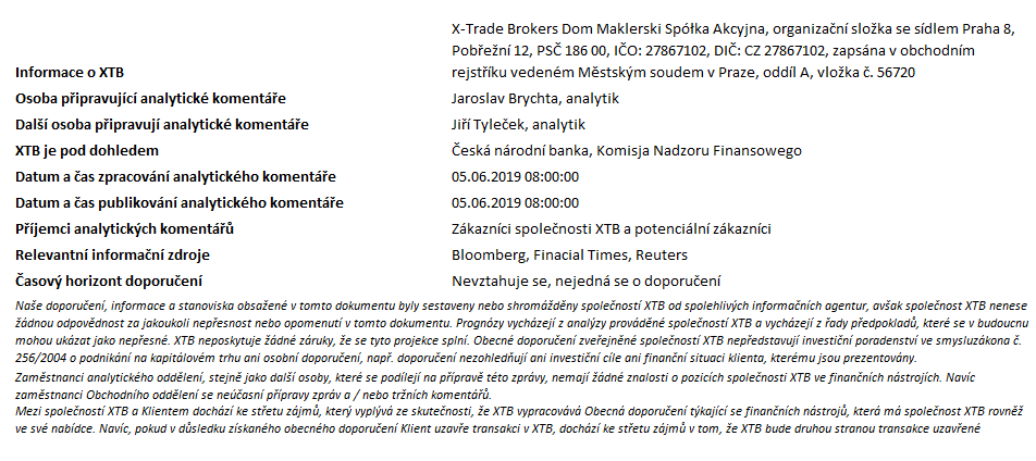 Tento materiál je marketingovou komunikáciou v zmysle čl. 24 ods. 3 smernice Európskeho parlamentu a Rady 2014/65/EÚ z 15. mája 2014 o trhoch s finančnými nástrojmi, ktorou sa mení smernica 2002/92/ES a smernica 2011/61/EÚ (MiFID II). Marketingová komunikácia nie je investičným odporúčaním ani informáciou odporúčajúcou alebo navrhujúcou investičnú stratégiu v zmysle nariadenia Európskeho parlamentu a Rady (EÚ) č. 596/2014 zo 16. apríla 2014 o zneužívaní trhu (nariadenie o zneužívaní trhu) a o zrušení smernice Európskeho parlamentu a Rady 2003/6/ES a smerníc Komisie 2003/124/ES, 2003/125/ES a 2004/72/ES a delegovaného nariadenia Komisie (EÚ) 2016/958 z 9. marca 2016, ktorým sa dopĺňa nariadenie Európskeho parlamentu a Rady (EÚ) č. 596/2014, pokiaľ ide o regulačné technické predpisy upravujúce technické opatrenia na objektívnu prezentáciu investičných odporúčaní alebo iných informácií, ktorými sa odporúča alebo navrhuje investičná stratégia, a na zverejňovanie osobitných záujmov alebo uvádzanie konfliktov záujmov v zmysle zákona č. 566/2001 Z. z. o cenných papieroch a investičných službách. Marketingová komunikácia je pripravená s najvyššou starostlivosťou, objektivitou, prezentuje fakty známe autorovi k dátumu prípravy a neobsahuje žiadne hodnotiace prvky. Marketingová komunikácia je pripravená bez zohľadnenia potrieb klienta, jeho individuálnej finančnej situácie a nijakým spôsobom nepredstavuje investičnú stratégiu. Marketingová komunikácia nepredstavuje ponuku na predaj, ponuku, predplatné, výzvu na nákup, reklamu alebo propagáciu akýchkoľvek finančných nástrojov. XTB S.A. organizačná zložka nezodpovedá za žiadne kroky alebo opomenutia klienta, najmä za nadobudnutie alebo predaj finančných nástrojov. XTB nezodpovedá za žiadnu stratu alebo škodu, vrátane, bez obmedzenia, akejkoľvek straty, ktorá môže vzniknúť priamo alebo nepriamo, spôsobená na základe informácií obsiahnutých v tejto marketingovej komunikácii. V prípade, že marketingová komunikácia obsahuje akékoľvek informácie o akýchkoľvek výsledkoch týkajúcich sa finančných nástrojov v nej uvedených, nepredstavujú žiadnu záruku ani prognózu budúcich výsledkov. Minulá výkonnosť nemusí nevyhnutne naznačovať budúce výsledky a každá osoba konajúca na základe týchto informácií tak robí výlučne na vlastné riziko.