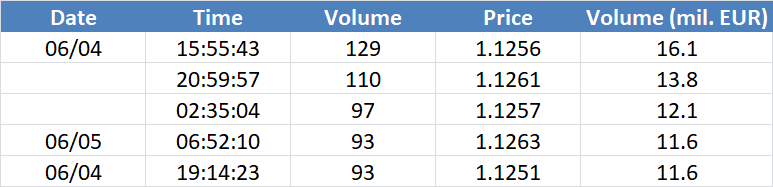 Největší obchody podle objemu na EURUSD (aktivní future kontrakt):