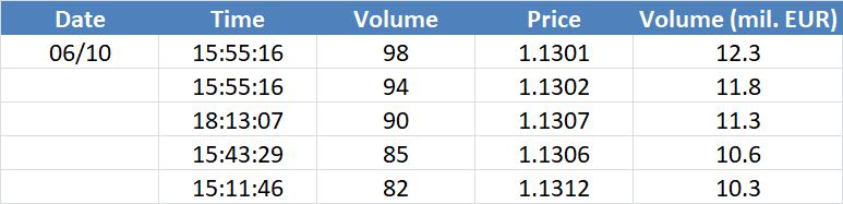 Největší obchody podle objemu na EURUSD (aktivní future kontrakt):