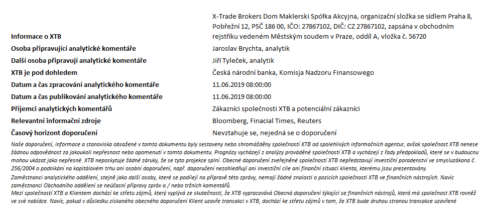 Tento materiál je marketingovou komunikáciou v zmysle čl. 24 ods. 3 smernice Európskeho parlamentu a Rady 2014/65/EÚ z 15. mája 2014 o trhoch s finančnými nástrojmi, ktorou sa mení smernica 2002/92/ES a smernica 2011/61/EÚ (MiFID II). Marketingová komunikácia nie je investičným odporúčaním ani informáciou odporúčajúcou alebo navrhujúcou investičnú stratégiu v zmysle nariadenia Európskeho parlamentu a Rady (EÚ) č. 596/2014 zo 16. apríla 2014 o zneužívaní trhu (nariadenie o zneužívaní trhu) a o zrušení smernice Európskeho parlamentu a Rady 2003/6/ES a smerníc Komisie 2003/124/ES, 2003/125/ES a 2004/72/ES a delegovaného nariadenia Komisie (EÚ) 2016/958 z 9. marca 2016, ktorým sa dopĺňa nariadenie Európskeho parlamentu a Rady (EÚ) č. 596/2014, pokiaľ ide o regulačné technické predpisy upravujúce technické opatrenia na objektívnu prezentáciu investičných odporúčaní alebo iných informácií, ktorými sa odporúča alebo navrhuje investičná stratégia, a na zverejňovanie osobitných záujmov alebo uvádzanie konfliktov záujmov v zmysle zákona č. 566/2001 Z. z. o cenných papieroch a investičných službách. Marketingová komunikácia je pripravená s najvyššou starostlivosťou, objektivitou, prezentuje fakty známe autorovi k dátumu prípravy a neobsahuje žiadne hodnotiace prvky. Marketingová komunikácia je pripravená bez zohľadnenia potrieb klienta, jeho individuálnej finančnej situácie a nijakým spôsobom nepredstavuje investičnú stratégiu. Marketingová komunikácia nepredstavuje ponuku na predaj, ponuku, predplatné, výzvu na nákup, reklamu alebo propagáciu akýchkoľvek finančných nástrojov. XTB S.A. organizačná zložka nezodpovedá za žiadne kroky alebo opomenutia klienta, najmä za nadobudnutie alebo predaj finančných nástrojov. XTB nezodpovedá za žiadnu stratu alebo škodu, vrátane, bez obmedzenia, akejkoľvek straty, ktorá môže vzniknúť priamo alebo nepriamo, spôsobená na základe informácií obsiahnutých v tejto marketingovej komunikácii. V prípade, že marketingová komunikácia obsahuje akékoľvek informácie o akýchkoľvek výsledkoch týkajúcich sa finančných nástrojov v nej uvedených, nepredstavujú žiadnu záruku ani prognózu budúcich výsledkov. Minulá výkonnosť nemusí nevyhnutne naznačovať budúce výsledky a každá osoba konajúca na základe týchto informácií tak robí výlučne na vlastné riziko.