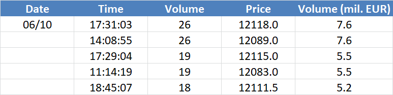 Největší obchody podle objemu na DAX (aktivní future kontrakt)