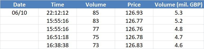 Největší obchody podle objemu na GBPUSD (aktivní future kontrakt): Největší denní objemy na trhu s měnovými futures. Na cenách, kde se včera objevily největší objemy, mohou být velcí hráči aktivní i dnes – zejména pokud se tyto ceny pohybují u některého ze včerejších high/low.