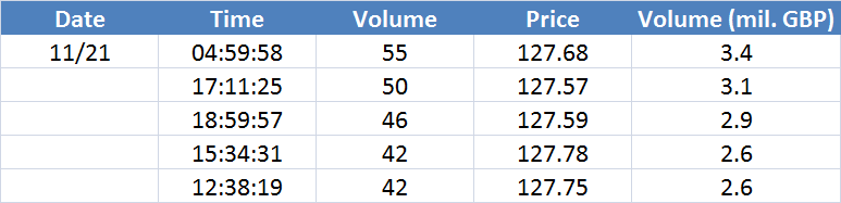 Největší obchody podle objemu na GBPUSD (aktivní future kontrakt):