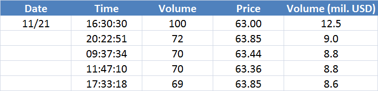 Největší obchody podle objemu na Brent (aktivní future kontrakt)