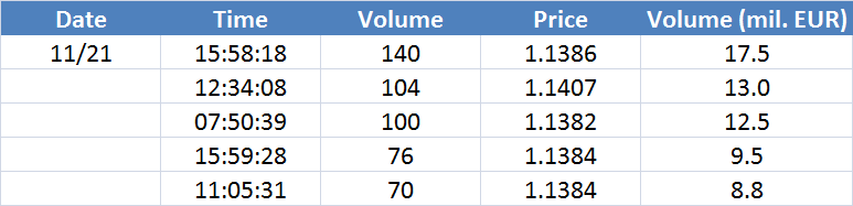 Největší obchody podle objemu na EURUSD (aktivní future kontrakt):