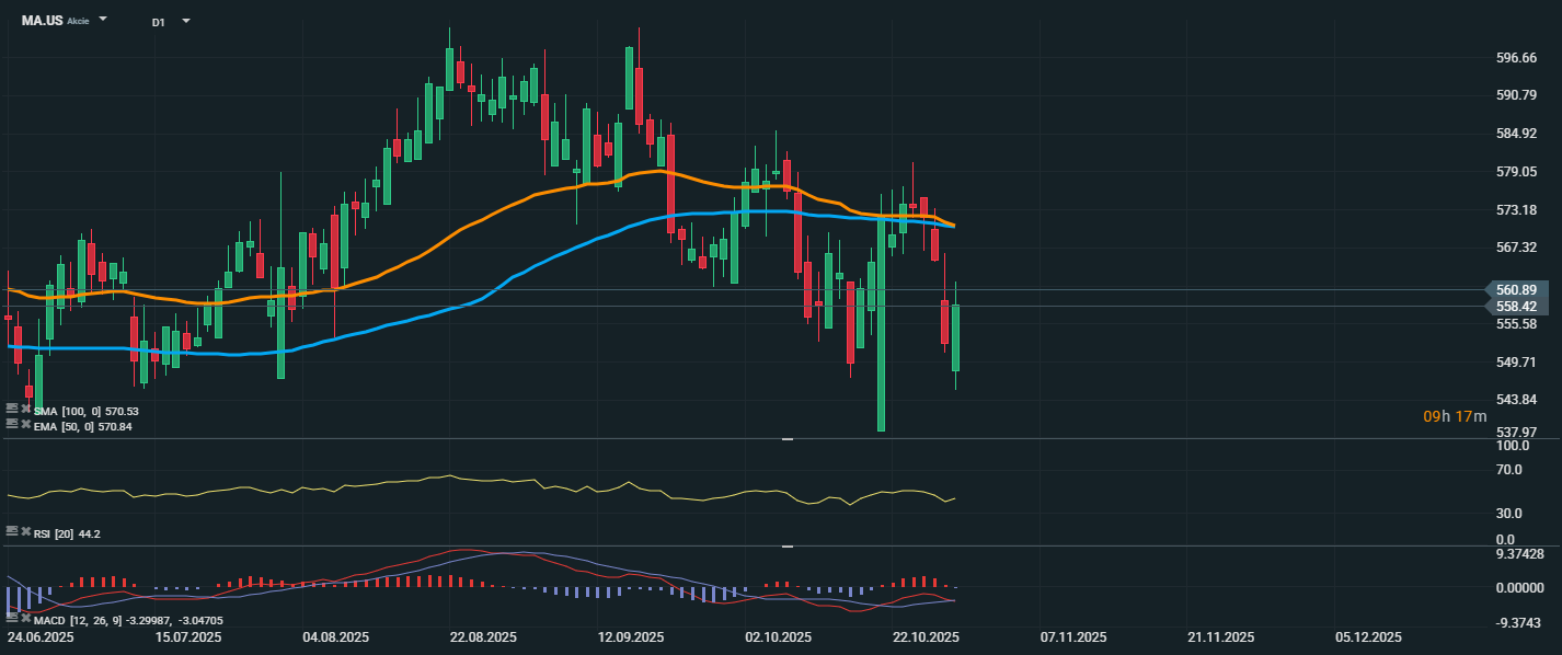 Akcie spoločnosti Mastercard sa obchodujú na úrovni 560,89 USD. Z technického hľadiska sa cena nachádza pod kĺzavými priemermi EMA 50 (570,84 USD) a SMA 100 (570,53 USD), čo potvrdzuje prevažujúci medvedí trend. RSI sa nachádza na hodnote 44,2, teda pod neutrálnou úrovňou 50, čo signalizuje mierne negatívne momentum, no stále s priestorom na ďalší pohyb.