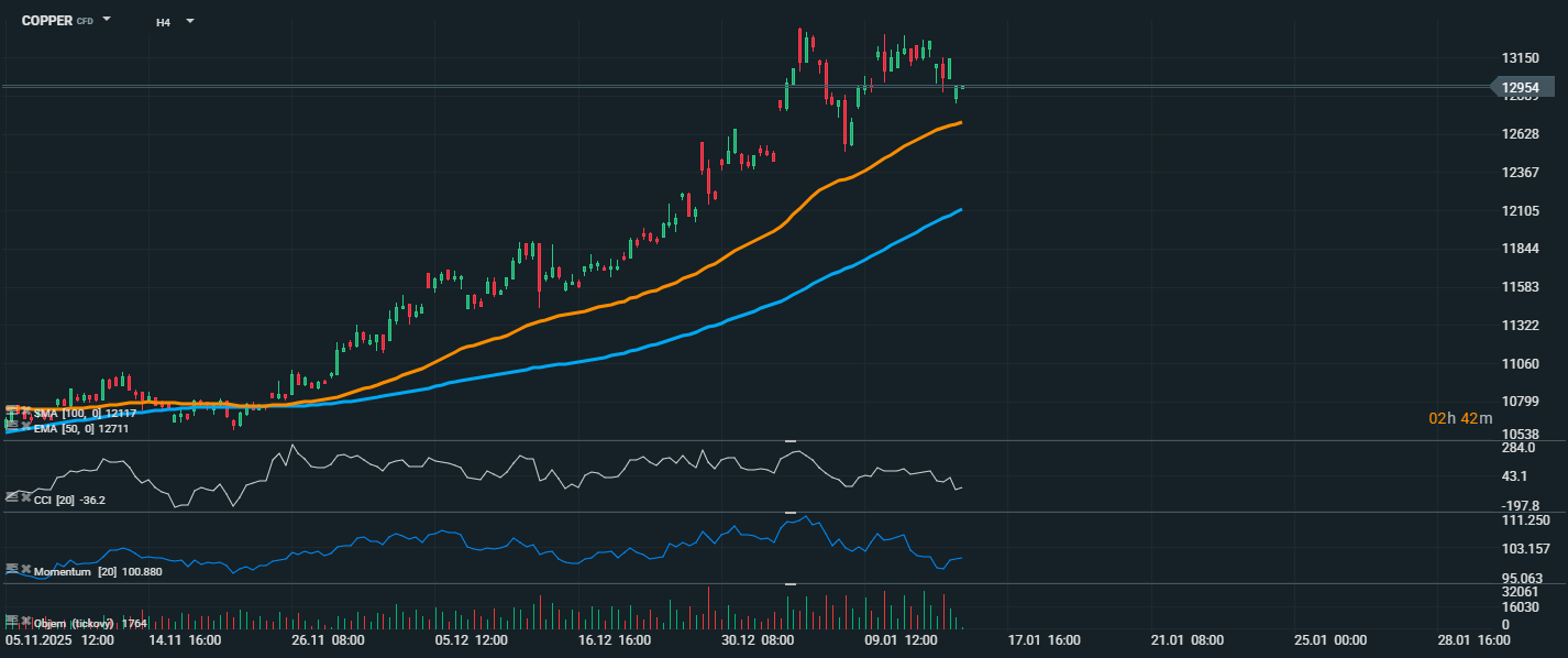 Cena medi sa aktuálne pohybuje na úrovni 12 954 USD a po nedávnom dosiahnutí historických maxím dochádza ku krátkodobej korekcii. Napriek tomu zostáva technický trend silne býčí, keďže cena sa stále drží nad EMA 50 (12 711 USD) aj SMA 100 (12 111 USD). CCI sa nachádza na hodnote -36,2, čo poukazuje na ochladenie tempa rastu, ale bez známok prepredanosti. Momentum (100,88) zostáva v kladnom pásme a naznačuje, že rastový impulz ešte úplne nevyprchal.