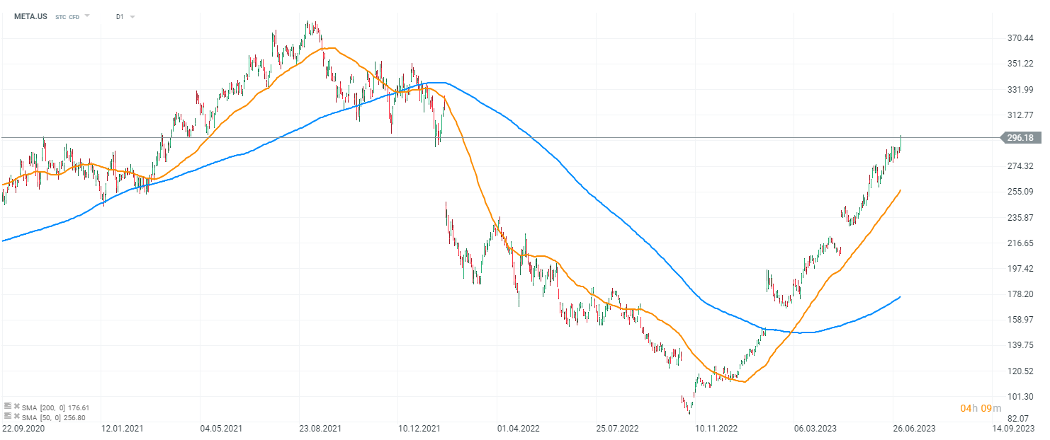 Akcie spoločnosti Meta (META.US) sa nachádzajú v jasnom rastúcom trende, nad 200 denným a 50 denným jednoduchým kĺzavým priemerom. Zdroj: xStation5