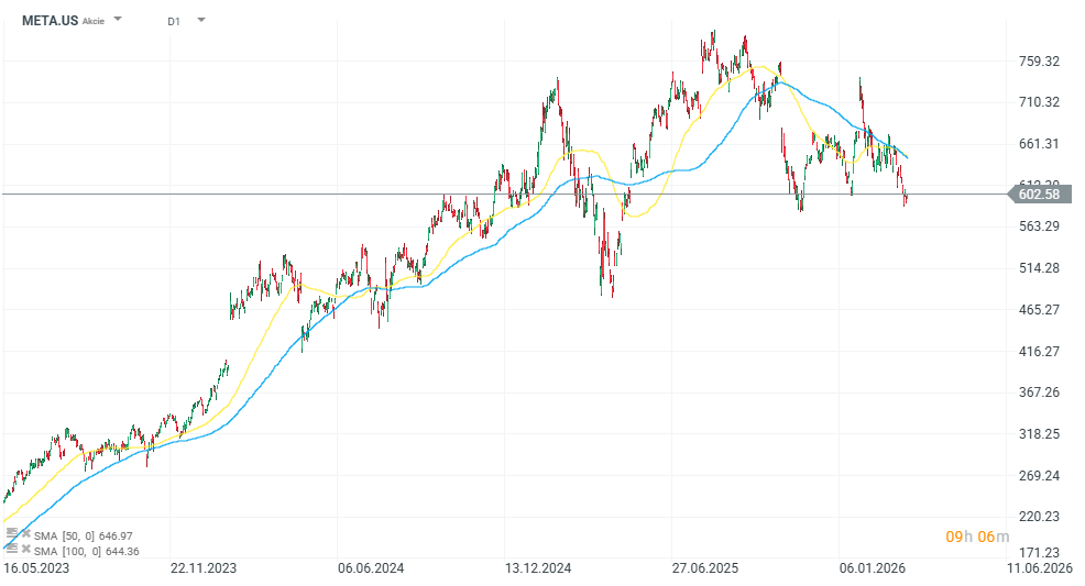 Cena akcií Meta za posledný rok klesla o 4 %, čím zaostala za všetkými ostatnými technologickými gigantmi s vysokou trhovou kapitalizáciou okrem Microsoftu, ktorý oslabil o 5 %. Spoločnosť Alphabet medzitým za posledný rok vzrástla o takmer 70 %. Aktuálne sa cena pohybuje okolo hranice 600 USD, pričom zo svojich maxím v roku 2025 klesla už o takmer 25 %.