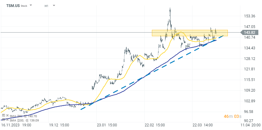 Akcie spoločnosti Taiwan Semiconductor Manufacturing Company (TSMC.US) dnes vzrástli o 2,46 % a tiež sa nachádzajú v blízkosti zóny odporu medzi 140 a 145 USD za akciu.