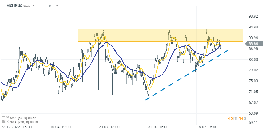Akcie spoločnosti Microchip Technology (MCHP.US) dnes získali 1,30 % a dosiahli 88,80 USD za akciu. Akcie sa odrazili od spodnej hranice podpory trendu a smerujú k zóne odporu medzi 90 - 94 USD.