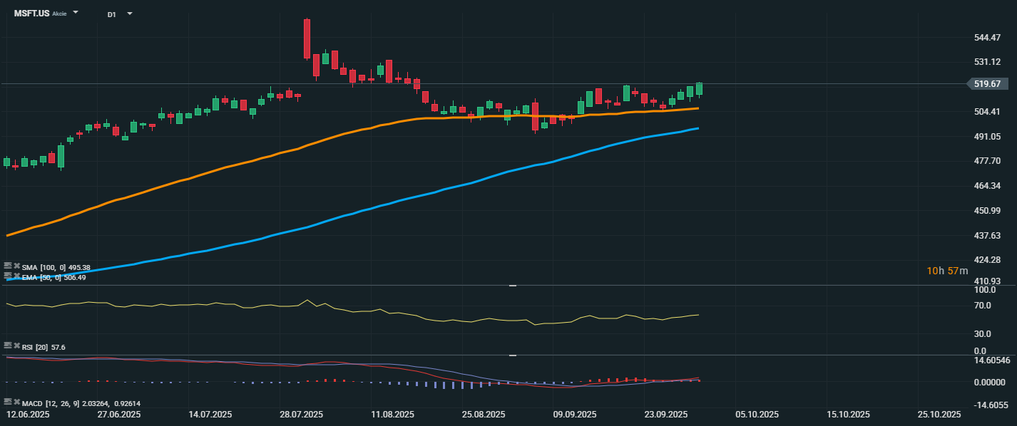 Akcie spoločnosti Microsoft sa aktuálne obchodujú na cene 519,67 USD a v posledných dňoch zaznamenali pozitívny cenový pohyb. Cena sa drží nad EMA 50 (506,49 USD) aj SMA 100 (495,38 USD), čo potvrdzuje návrat býčieho sentimentu. RSI sa nachádza na hodnote 57,6, teda v neutrálnom pásme s ľahkým nákupným nastavením, čo naznačuje priestor pre ďalší rast bez rizika prekúpenosti.