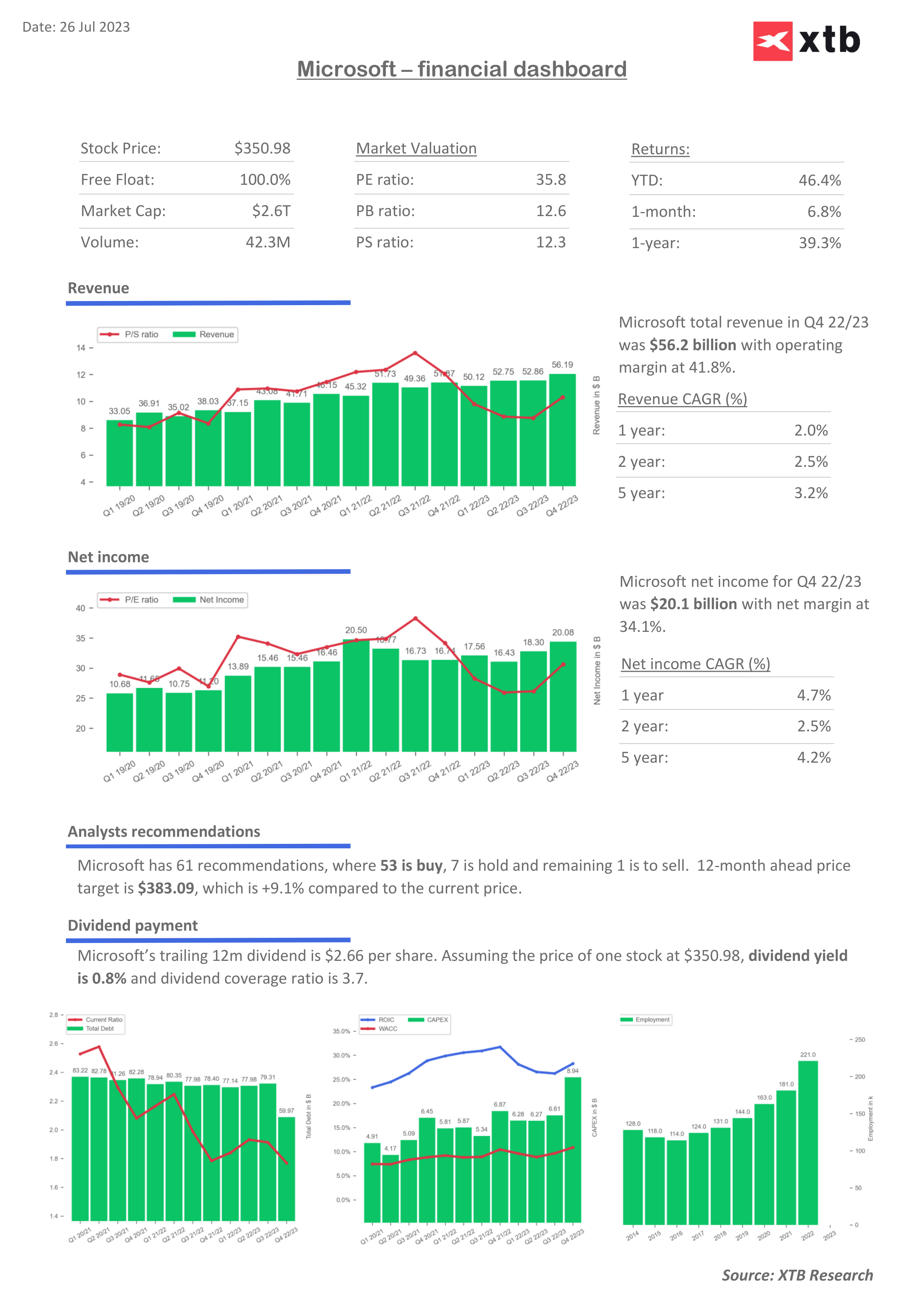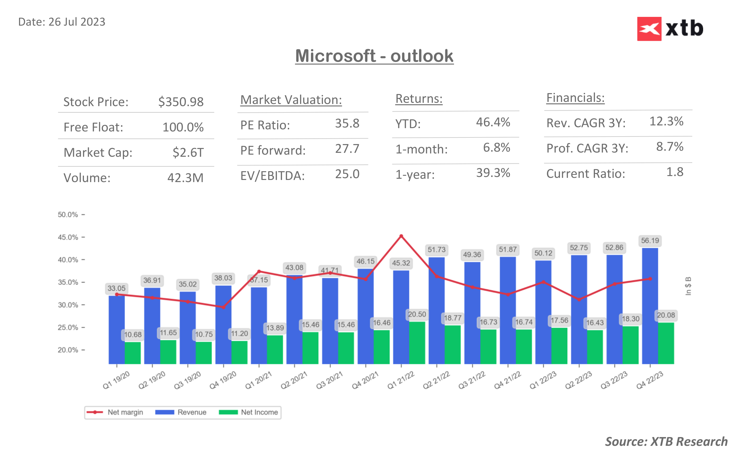 Výsledky spoločnosti Microsoft za 4. fiškálny štvrťrok 2023 (apríl - jún 2023) boli väčšinou v súlade s očakávaniami trhu. Celkové tržby medziročne vzrástli o 8,3 %, čo je o niečo viac, ako sa očakávalo. Prispel k tomu dobrý výkon segmentu inteligentného cloudu. Celkové tržby za cloud dosiahli v tomto štvrťroku 30,3 miliardy USD a boli medziročne vyššie o 21 %. Rast v oblasti Microsoft Azure Cloud pri konštantných menových kurzoch dosiahol počas štvrťroka 27 %. Ide síce o spomalenie, ale tempo spomaľovania sa začína zmierňovať a to sa hodnotí pozitívne. Kapitálové výdavky boli počas štvrťroka oveľa vyššie, než sa očakávalo, ale očakáva sa, že po niekoľkých rokoch rastúcich investícií sa zmiernia, a to napriek tomu, že Microsoft zavádza a posilňuje svoju ponuku umelej inteligencie.