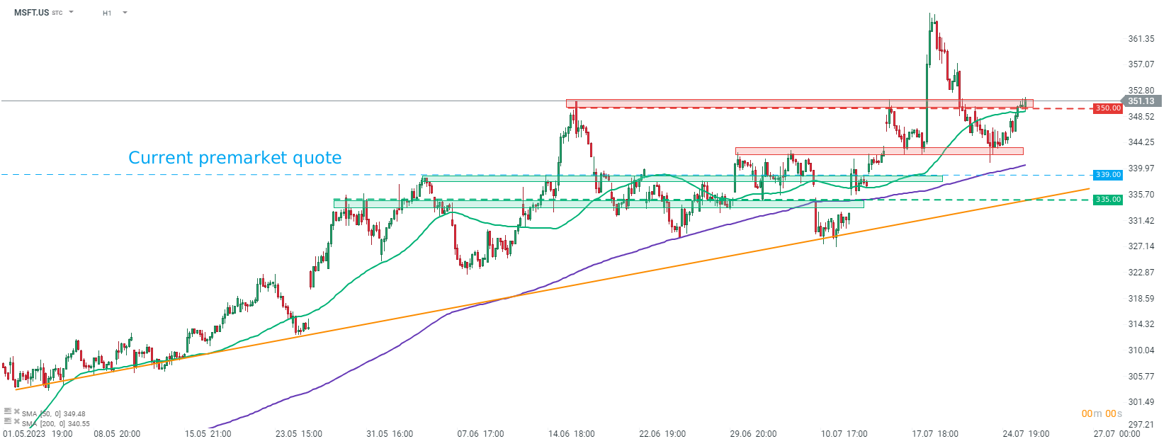 Akcie spoločnosti Microsoft (MSFT.US) sa dnes v predburzovom období obchodujú približne o 3,5 % nižšie. Akcie včera dosiahli zónu rezistencie 350 USD, ale nepodarilo sa im ju prelomiť. Akcie sa v súčasnosti v predpredaji obchodujú v blízkosti 339 USD - pod 200-hodinovým kĺzavým priemerom (fialová čiara), ale nad krátkodobou líniou rastúceho trendu. Zónu podpory, ktorú treba sledovať, možno nájsť v oblasti 335 USD, kde sa nachádzajú predchádzajúce cenové reakcie, ako aj spomínaná trendová línia.