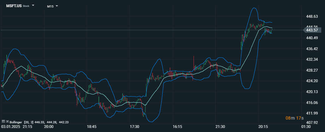 15-minútový graf zobrazujúci pohyb akcií Microsoftu (MSFT.US) dňa 3. januára 2025, analyzované pomocou Bollingerových pásiem (perióda 20). Akcie zaznamenávajú prielom nad horné pásmo okolo 20:15, pričom dosahujú vrchol na 448,63 USD, predtým než sa ustália blízko 443,57 USD. Zdroj: xStation5