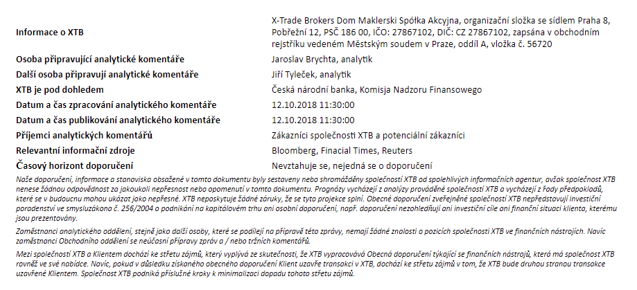 Tento materiál je marketingovou komunikáciou v zmysle čl. 24 ods. 3 smernice Európskeho parlamentu a Rady 2014/65/EÚ z 15. mája 2014 o trhoch s finančnými nástrojmi, ktorou sa mení smernica 2002/92/ES a smernica 2011/61/EÚ (MiFID II). Marketingová komunikácia nie je investičným odporúčaním ani informáciou odporúčajúcou alebo navrhujúcou investičnú stratégiu v zmysle nariadenia Európskeho parlamentu a Rady (EÚ) č. 596/2014 zo 16. apríla 2014 o zneužívaní trhu (nariadenie o zneužívaní trhu) a o zrušení smernice Európskeho parlamentu a Rady 2003/6/ES a smerníc Komisie 2003/124/ES, 2003/125/ES a 2004/72/ES a delegovaného nariadenia Komisie (EÚ) 2016/958 z 9. marca 2016, ktorým sa dopĺňa nariadenie Európskeho parlamentu a Rady (EÚ) č. 596/2014, pokiaľ ide o regulačné technické predpisy upravujúce technické opatrenia na objektívnu prezentáciu investičných odporúčaní alebo iných informácií, ktorými sa odporúča alebo navrhuje investičná stratégia, a na zverejňovanie osobitných záujmov alebo uvádzanie konfliktov záujmov v zmysle zákona č. 566/2001 Z. z. o cenných papieroch a investičných službách. Marketingová komunikácia je pripravená s najvyššou starostlivosťou, objektivitou, prezentuje fakty známe autorovi k dátumu prípravy a neobsahuje žiadne hodnotiace prvky. Marketingová komunikácia je pripravená bez zohľadnenia potrieb klienta, jeho individuálnej finančnej situácie a nijakým spôsobom nepredstavuje investičnú stratégiu. Marketingová komunikácia nepredstavuje ponuku na predaj, ponuku, predplatné, výzvu na nákup, reklamu alebo propagáciu akýchkoľvek finančných nástrojov. XTB S.A. organizačná zložka nezodpovedá za žiadne kroky alebo opomenutia klienta, najmä za nadobudnutie alebo predaj finančných nástrojov. XTB nezodpovedá za žiadnu stratu alebo škodu, vrátane, bez obmedzenia, akejkoľvek straty, ktorá môže vzniknúť priamo alebo nepriamo, spôsobená na základe informácií obsiahnutých v tejto marketingovej komunikácii. V prípade, že marketingová komunikácia obsahuje akékoľvek informácie o akýchkoľvek výsledkoch týkajúcich sa finančných nástrojov v nej uvedených, nepredstavujú žiadnu záruku ani prognózu budúcich výsledkov. Minulá výkonnosť nemusí nevyhnutne naznačovať budúce výsledky a každá osoba konajúca na základe týchto informácií tak robí výlučne na vlastné riziko.