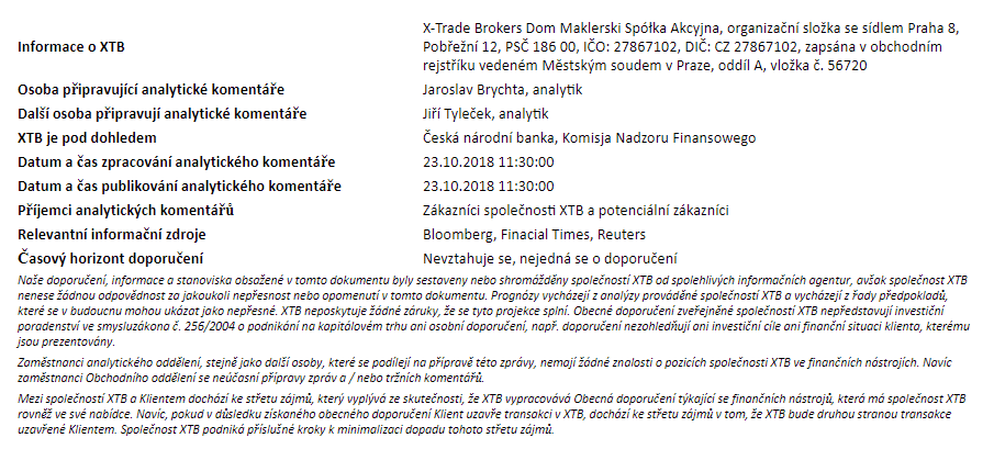 Tento materiál je marketingovou komunikáciou v zmysle čl. 24 ods. 3 smernice Európskeho parlamentu a Rady 2014/65/EÚ z 15. mája 2014 o trhoch s finančnými nástrojmi, ktorou sa mení smernica 2002/92/ES a smernica 2011/61/EÚ (MiFID II). Marketingová komunikácia nie je investičným odporúčaním ani informáciou odporúčajúcou alebo navrhujúcou investičnú stratégiu v zmysle nariadenia Európskeho parlamentu a Rady (EÚ) č. 596/2014 zo 16. apríla 2014 o zneužívaní trhu (nariadenie o zneužívaní trhu) a o zrušení smernice Európskeho parlamentu a Rady 2003/6/ES a smerníc Komisie 2003/124/ES, 2003/125/ES a 2004/72/ES a delegovaného nariadenia Komisie (EÚ) 2016/958 z 9. marca 2016, ktorým sa dopĺňa nariadenie Európskeho parlamentu a Rady (EÚ) č. 596/2014, pokiaľ ide o regulačné technické predpisy upravujúce technické opatrenia na objektívnu prezentáciu investičných odporúčaní alebo iných informácií, ktorými sa odporúča alebo navrhuje investičná stratégia, a na zverejňovanie osobitných záujmov alebo uvádzanie konfliktov záujmov v zmysle zákona č. 566/2001 Z. z. o cenných papieroch a investičných službách. Marketingová komunikácia je pripravená s najvyššou starostlivosťou, objektivitou, prezentuje fakty známe autorovi k dátumu prípravy a neobsahuje žiadne hodnotiace prvky. Marketingová komunikácia je pripravená bez zohľadnenia potrieb klienta, jeho individuálnej finančnej situácie a nijakým spôsobom nepredstavuje investičnú stratégiu. Marketingová komunikácia nepredstavuje ponuku na predaj, ponuku, predplatné, výzvu na nákup, reklamu alebo propagáciu akýchkoľvek finančných nástrojov. XTB S.A. organizačná zložka nezodpovedá za žiadne kroky alebo opomenutia klienta, najmä za nadobudnutie alebo predaj finančných nástrojov. XTB nezodpovedá za žiadnu stratu alebo škodu, vrátane, bez obmedzenia, akejkoľvek straty, ktorá môže vzniknúť priamo alebo nepriamo, spôsobená na základe informácií obsiahnutých v tejto marketingovej komunikácii. V prípade, že marketingová komunikácia obsahuje akékoľvek informácie o akýchkoľvek výsledkoch týkajúcich sa finančných nástrojov v nej uvedených, nepredstavujú žiadnu záruku ani prognózu budúcich výsledkov. Minulá výkonnosť nemusí nevyhnutne naznačovať budúce výsledky a každá osoba konajúca na základe týchto informácií tak robí výlučne na vlastné riziko.