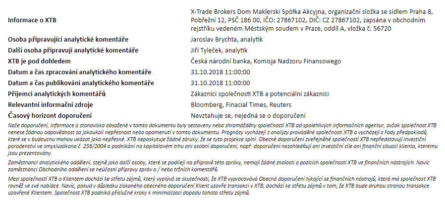 Tento materiál je marketingovou komunikáciou v zmysle čl. 24 ods. 3 smernice Európskeho parlamentu a Rady 2014/65/EÚ z 15. mája 2014 o trhoch s finančnými nástrojmi, ktorou sa mení smernica 2002/92/ES a smernica 2011/61/EÚ (MiFID II). Marketingová komunikácia nie je investičným odporúčaním ani informáciou odporúčajúcou alebo navrhujúcou investičnú stratégiu v zmysle nariadenia Európskeho parlamentu a Rady (EÚ) č. 596/2014 zo 16. apríla 2014 o zneužívaní trhu (nariadenie o zneužívaní trhu) a o zrušení smernice Európskeho parlamentu a Rady 2003/6/ES a smerníc Komisie 2003/124/ES, 2003/125/ES a 2004/72/ES a delegovaného nariadenia Komisie (EÚ) 2016/958 z 9. marca 2016, ktorým sa dopĺňa nariadenie Európskeho parlamentu a Rady (EÚ) č. 596/2014, pokiaľ ide o regulačné technické predpisy upravujúce technické opatrenia na objektívnu prezentáciu investičných odporúčaní alebo iných informácií, ktorými sa odporúča alebo navrhuje investičná stratégia, a na zverejňovanie osobitných záujmov alebo uvádzanie konfliktov záujmov v zmysle zákona č. 566/2001 Z. z. o cenných papieroch a investičných službách. Marketingová komunikácia je pripravená s najvyššou starostlivosťou, objektivitou, prezentuje fakty známe autorovi k dátumu prípravy a neobsahuje žiadne hodnotiace prvky. Marketingová komunikácia je pripravená bez zohľadnenia potrieb klienta, jeho individuálnej finančnej situácie a nijakým spôsobom nepredstavuje investičnú stratégiu. Marketingová komunikácia nepredstavuje ponuku na predaj, ponuku, predplatné, výzvu na nákup, reklamu alebo propagáciu akýchkoľvek finančných nástrojov. XTB S.A. organizačná zložka nezodpovedá za žiadne kroky alebo opomenutia klienta, najmä za nadobudnutie alebo predaj finančných nástrojov. XTB nezodpovedá za žiadnu stratu alebo škodu, vrátane, bez obmedzenia, akejkoľvek straty, ktorá môže vzniknúť priamo alebo nepriamo, spôsobená na základe informácií obsiahnutých v tejto marketingovej komunikácii. V prípade, že marketingová komunikácia obsahuje akékoľvek informácie o akýchkoľvek výsledkoch týkajúcich sa finančných nástrojov v nej uvedených, nepredstavujú žiadnu záruku ani prognózu budúcich výsledkov. Minulá výkonnosť nemusí nevyhnutne naznačovať budúce výsledky a každá osoba konajúca na základe týchto informácií tak robí výlučne na vlastné riziko.