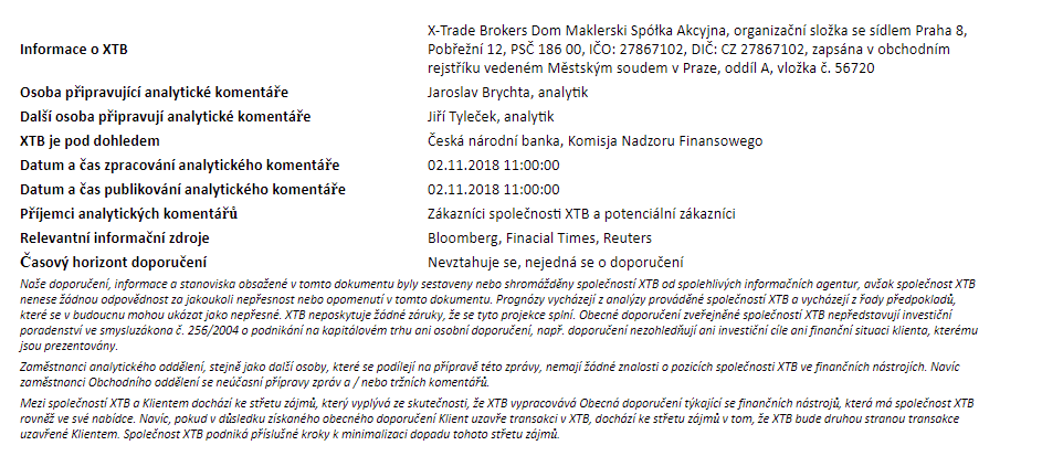 Tento materiál je marketingovou komunikáciou v zmysle čl. 24 ods. 3 smernice Európskeho parlamentu a Rady 2014/65/EÚ z 15. mája 2014 o trhoch s finančnými nástrojmi, ktorou sa mení smernica 2002/92/ES a smernica 2011/61/EÚ (MiFID II). Marketingová komunikácia nie je investičným odporúčaním ani informáciou odporúčajúcou alebo navrhujúcou investičnú stratégiu v zmysle nariadenia Európskeho parlamentu a Rady (EÚ) č. 596/2014 zo 16. apríla 2014 o zneužívaní trhu (nariadenie o zneužívaní trhu) a o zrušení smernice Európskeho parlamentu a Rady 2003/6/ES a smerníc Komisie 2003/124/ES, 2003/125/ES a 2004/72/ES a delegovaného nariadenia Komisie (EÚ) 2016/958 z 9. marca 2016, ktorým sa dopĺňa nariadenie Európskeho parlamentu a Rady (EÚ) č. 596/2014, pokiaľ ide o regulačné technické predpisy upravujúce technické opatrenia na objektívnu prezentáciu investičných odporúčaní alebo iných informácií, ktorými sa odporúča alebo navrhuje investičná stratégia, a na zverejňovanie osobitných záujmov alebo uvádzanie konfliktov záujmov v zmysle zákona č. 566/2001 Z. z. o cenných papieroch a investičných službách. Marketingová komunikácia je pripravená s najvyššou starostlivosťou, objektivitou, prezentuje fakty známe autorovi k dátumu prípravy a neobsahuje žiadne hodnotiace prvky. Marketingová komunikácia je pripravená bez zohľadnenia potrieb klienta, jeho individuálnej finančnej situácie a nijakým spôsobom nepredstavuje investičnú stratégiu. Marketingová komunikácia nepredstavuje ponuku na predaj, ponuku, predplatné, výzvu na nákup, reklamu alebo propagáciu akýchkoľvek finančných nástrojov. XTB S.A. organizačná zložka nezodpovedá za žiadne kroky alebo opomenutia klienta, najmä za nadobudnutie alebo predaj finančných nástrojov. XTB nezodpovedá za žiadnu stratu alebo škodu, vrátane, bez obmedzenia, akejkoľvek straty, ktorá môže vzniknúť priamo alebo nepriamo, spôsobená na základe informácií obsiahnutých v tejto marketingovej komunikácii. V prípade, že marketingová komunikácia obsahuje akékoľvek informácie o akýchkoľvek výsledkoch týkajúcich sa finančných nástrojov v nej uvedených, nepredstavujú žiadnu záruku ani prognózu budúcich výsledkov. Minulá výkonnosť nemusí nevyhnutne naznačovať budúce výsledky a každá osoba konajúca na základe týchto informácií tak robí výlučne na vlastné riziko.