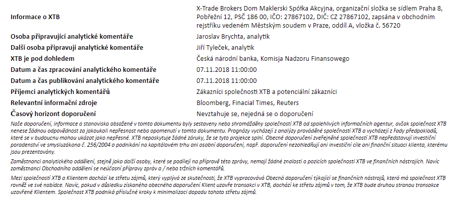 Tento materiál je marketingovou komunikáciou v zmysle čl. 24 ods. 3 smernice Európskeho parlamentu a Rady 2014/65/EÚ z 15. mája 2014 o trhoch s finančnými nástrojmi, ktorou sa mení smernica 2002/92/ES a smernica 2011/61/EÚ (MiFID II). Marketingová komunikácia nie je investičným odporúčaním ani informáciou odporúčajúcou alebo navrhujúcou investičnú stratégiu v zmysle nariadenia Európskeho parlamentu a Rady (EÚ) č. 596/2014 zo 16. apríla 2014 o zneužívaní trhu (nariadenie o zneužívaní trhu) a o zrušení smernice Európskeho parlamentu a Rady 2003/6/ES a smerníc Komisie 2003/124/ES, 2003/125/ES a 2004/72/ES a delegovaného nariadenia Komisie (EÚ) 2016/958 z 9. marca 2016, ktorým sa dopĺňa nariadenie Európskeho parlamentu a Rady (EÚ) č. 596/2014, pokiaľ ide o regulačné technické predpisy upravujúce technické opatrenia na objektívnu prezentáciu investičných odporúčaní alebo iných informácií, ktorými sa odporúča alebo navrhuje investičná stratégia, a na zverejňovanie osobitných záujmov alebo uvádzanie konfliktov záujmov v zmysle zákona č. 566/2001 Z. z. o cenných papieroch a investičných službách. Marketingová komunikácia je pripravená s najvyššou starostlivosťou, objektivitou, prezentuje fakty známe autorovi k dátumu prípravy a neobsahuje žiadne hodnotiace prvky. Marketingová komunikácia je pripravená bez zohľadnenia potrieb klienta, jeho individuálnej finančnej situácie a nijakým spôsobom nepredstavuje investičnú stratégiu. Marketingová komunikácia nepredstavuje ponuku na predaj, ponuku, predplatné, výzvu na nákup, reklamu alebo propagáciu akýchkoľvek finančných nástrojov. XTB S.A. organizačná zložka nezodpovedá za žiadne kroky alebo opomenutia klienta, najmä za nadobudnutie alebo predaj finančných nástrojov. XTB nezodpovedá za žiadnu stratu alebo škodu, vrátane, bez obmedzenia, akejkoľvek straty, ktorá môže vzniknúť priamo alebo nepriamo, spôsobená na základe informácií obsiahnutých v tejto marketingovej komunikácii. V prípade, že marketingová komunikácia obsahuje akékoľvek informácie o akýchkoľvek výsledkoch týkajúcich sa finančných nástrojov v nej uvedených, nepredstavujú žiadnu záruku ani prognózu budúcich výsledkov. Minulá výkonnosť nemusí nevyhnutne naznačovať budúce výsledky a každá osoba konajúca na základe týchto informácií tak robí výlučne na vlastné riziko.