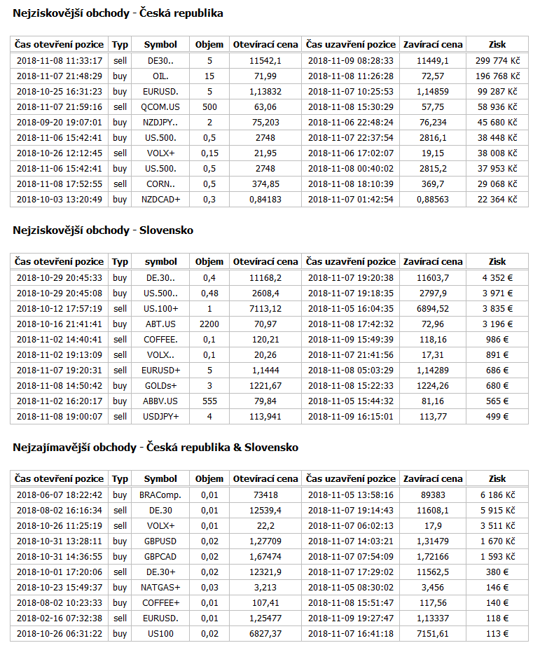 Tabulky: Nejlepší obchody na uvedených instrumentech