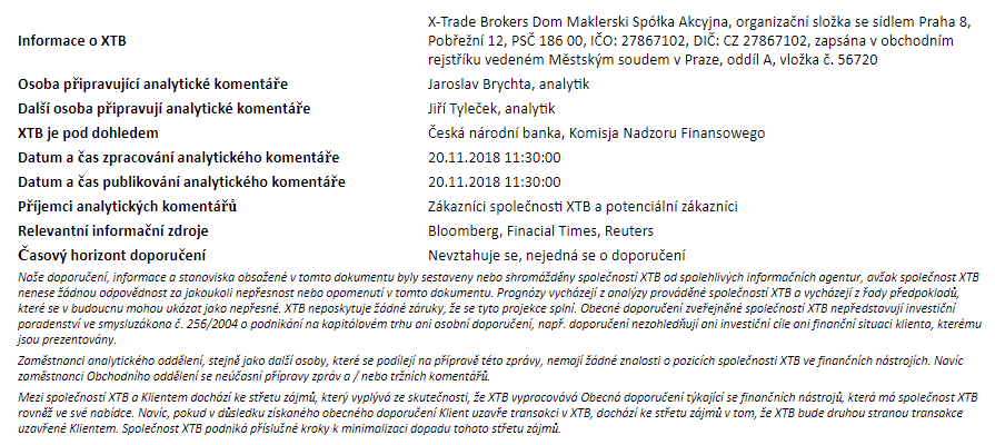 Tento materiál je marketingovou komunikáciou v zmysle čl. 24 ods. 3 smernice Európskeho parlamentu a Rady 2014/65/EÚ z 15. mája 2014 o trhoch s finančnými nástrojmi, ktorou sa mení smernica 2002/92/ES a smernica 2011/61/EÚ (MiFID II). Marketingová komunikácia nie je investičným odporúčaním ani informáciou odporúčajúcou alebo navrhujúcou investičnú stratégiu v zmysle nariadenia Európskeho parlamentu a Rady (EÚ) č. 596/2014 zo 16. apríla 2014 o zneužívaní trhu (nariadenie o zneužívaní trhu) a o zrušení smernice Európskeho parlamentu a Rady 2003/6/ES a smerníc Komisie 2003/124/ES, 2003/125/ES a 2004/72/ES a delegovaného nariadenia Komisie (EÚ) 2016/958 z 9. marca 2016, ktorým sa dopĺňa nariadenie Európskeho parlamentu a Rady (EÚ) č. 596/2014, pokiaľ ide o regulačné technické predpisy upravujúce technické opatrenia na objektívnu prezentáciu investičných odporúčaní alebo iných informácií, ktorými sa odporúča alebo navrhuje investičná stratégia, a na zverejňovanie osobitných záujmov alebo uvádzanie konfliktov záujmov v zmysle zákona č. 566/2001 Z. z. o cenných papieroch a investičných službách. Marketingová komunikácia je pripravená s najvyššou starostlivosťou, objektivitou, prezentuje fakty známe autorovi k dátumu prípravy a neobsahuje žiadne hodnotiace prvky. Marketingová komunikácia je pripravená bez zohľadnenia potrieb klienta, jeho individuálnej finančnej situácie a nijakým spôsobom nepredstavuje investičnú stratégiu. Marketingová komunikácia nepredstavuje ponuku na predaj, ponuku, predplatné, výzvu na nákup, reklamu alebo propagáciu akýchkoľvek finančných nástrojov. XTB S.A. organizačná zložka nezodpovedá za žiadne kroky alebo opomenutia klienta, najmä za nadobudnutie alebo predaj finančných nástrojov. XTB nezodpovedá za žiadnu stratu alebo škodu, vrátane, bez obmedzenia, akejkoľvek straty, ktorá môže vzniknúť priamo alebo nepriamo, spôsobená na základe informácií obsiahnutých v tejto marketingovej komunikácii. V prípade, že marketingová komunikácia obsahuje akékoľvek informácie o akýchkoľvek výsledkoch týkajúcich sa finančných nástrojov v nej uvedených, nepredstavujú žiadnu záruku ani prognózu budúcich výsledkov. Minulá výkonnosť nemusí nevyhnutne naznačovať budúce výsledky a každá osoba konajúca na základe týchto informácií tak robí výlučne na vlastné riziko.