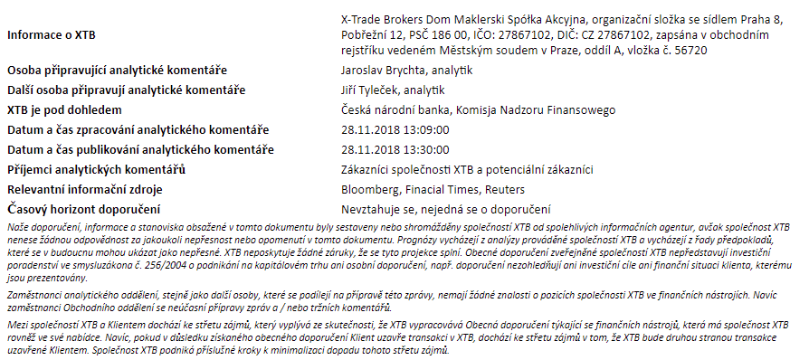 Tento materiál je marketingovou komunikáciou v zmysle čl. 24 ods. 3 smernice Európskeho parlamentu a Rady 2014/65/EÚ z 15. mája 2014 o trhoch s finančnými nástrojmi, ktorou sa mení smernica 2002/92/ES a smernica 2011/61/EÚ (MiFID II). Marketingová komunikácia nie je investičným odporúčaním ani informáciou odporúčajúcou alebo navrhujúcou investičnú stratégiu v zmysle nariadenia Európskeho parlamentu a Rady (EÚ) č. 596/2014 zo 16. apríla 2014 o zneužívaní trhu (nariadenie o zneužívaní trhu) a o zrušení smernice Európskeho parlamentu a Rady 2003/6/ES a smerníc Komisie 2003/124/ES, 2003/125/ES a 2004/72/ES a delegovaného nariadenia Komisie (EÚ) 2016/958 z 9. marca 2016, ktorým sa dopĺňa nariadenie Európskeho parlamentu a Rady (EÚ) č. 596/2014, pokiaľ ide o regulačné technické predpisy upravujúce technické opatrenia na objektívnu prezentáciu investičných odporúčaní alebo iných informácií, ktorými sa odporúča alebo navrhuje investičná stratégia, a na zverejňovanie osobitných záujmov alebo uvádzanie konfliktov záujmov v zmysle zákona č. 566/2001 Z. z. o cenných papieroch a investičných službách. Marketingová komunikácia je pripravená s najvyššou starostlivosťou, objektivitou, prezentuje fakty známe autorovi k dátumu prípravy a neobsahuje žiadne hodnotiace prvky. Marketingová komunikácia je pripravená bez zohľadnenia potrieb klienta, jeho individuálnej finančnej situácie a nijakým spôsobom nepredstavuje investičnú stratégiu. Marketingová komunikácia nepredstavuje ponuku na predaj, ponuku, predplatné, výzvu na nákup, reklamu alebo propagáciu akýchkoľvek finančných nástrojov. XTB S.A. organizačná zložka nezodpovedá za žiadne kroky alebo opomenutia klienta, najmä za nadobudnutie alebo predaj finančných nástrojov. XTB nezodpovedá za žiadnu stratu alebo škodu, vrátane, bez obmedzenia, akejkoľvek straty, ktorá môže vzniknúť priamo alebo nepriamo, spôsobená na základe informácií obsiahnutých v tejto marketingovej komunikácii. V prípade, že marketingová komunikácia obsahuje akékoľvek informácie o akýchkoľvek výsledkoch týkajúcich sa finančných nástrojov v nej uvedených, nepredstavujú žiadnu záruku ani prognózu budúcich výsledkov. Minulá výkonnosť nemusí nevyhnutne naznačovať budúce výsledky a každá osoba konajúca na základe týchto informácií tak robí výlučne na vlastné riziko.