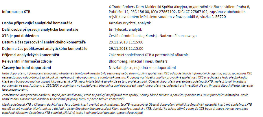 Tento materiál je marketingovou komunikáciou v zmysle čl. 24 ods. 3 smernice Európskeho parlamentu a Rady 2014/65/EÚ z 15. mája 2014 o trhoch s finančnými nástrojmi, ktorou sa mení smernica 2002/92/ES a smernica 2011/61/EÚ (MiFID II). Marketingová komunikácia nie je investičným odporúčaním ani informáciou odporúčajúcou alebo navrhujúcou investičnú stratégiu v zmysle nariadenia Európskeho parlamentu a Rady (EÚ) č. 596/2014 zo 16. apríla 2014 o zneužívaní trhu (nariadenie o zneužívaní trhu) a o zrušení smernice Európskeho parlamentu a Rady 2003/6/ES a smerníc Komisie 2003/124/ES, 2003/125/ES a 2004/72/ES a delegovaného nariadenia Komisie (EÚ) 2016/958 z 9. marca 2016, ktorým sa dopĺňa nariadenie Európskeho parlamentu a Rady (EÚ) č. 596/2014, pokiaľ ide o regulačné technické predpisy upravujúce technické opatrenia na objektívnu prezentáciu investičných odporúčaní alebo iných informácií, ktorými sa odporúča alebo navrhuje investičná stratégia, a na zverejňovanie osobitných záujmov alebo uvádzanie konfliktov záujmov v zmysle zákona č. 566/2001 Z. z. o cenných papieroch a investičných službách. Marketingová komunikácia je pripravená s najvyššou starostlivosťou, objektivitou, prezentuje fakty známe autorovi k dátumu prípravy a neobsahuje žiadne hodnotiace prvky. Marketingová komunikácia je pripravená bez zohľadnenia potrieb klienta, jeho individuálnej finančnej situácie a nijakým spôsobom nepredstavuje investičnú stratégiu. Marketingová komunikácia nepredstavuje ponuku na predaj, ponuku, predplatné, výzvu na nákup, reklamu alebo propagáciu akýchkoľvek finančných nástrojov. XTB S.A. organizačná zložka nezodpovedá za žiadne kroky alebo opomenutia klienta, najmä za nadobudnutie alebo predaj finančných nástrojov. XTB nezodpovedá za žiadnu stratu alebo škodu, vrátane, bez obmedzenia, akejkoľvek straty, ktorá môže vzniknúť priamo alebo nepriamo, spôsobená na základe informácií obsiahnutých v tejto marketingovej komunikácii. V prípade, že marketingová komunikácia obsahuje akékoľvek informácie o akýchkoľvek výsledkoch týkajúcich sa finančných nástrojov v nej uvedených, nepredstavujú žiadnu záruku ani prognózu budúcich výsledkov. Minulá výkonnosť nemusí nevyhnutne naznačovať budúce výsledky a každá osoba konajúca na základe týchto informácií tak robí výlučne na vlastné riziko.