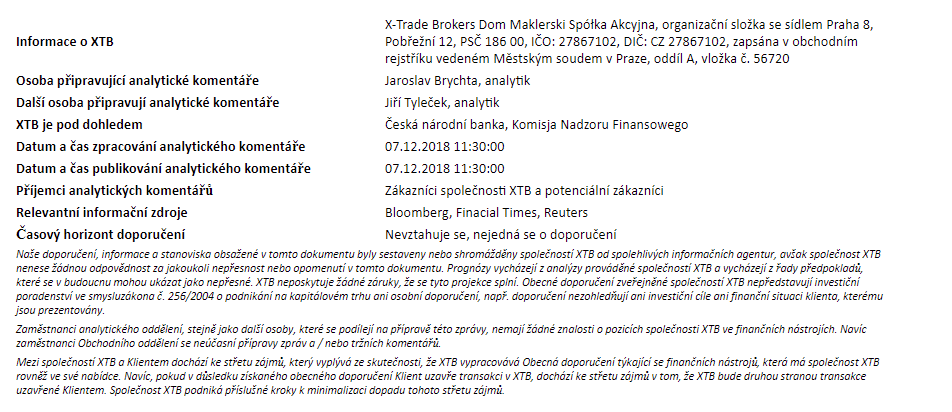 Tento materiál je marketingovou komunikáciou v zmysle čl. 24 ods. 3 smernice Európskeho parlamentu a Rady 2014/65/EÚ z 15. mája 2014 o trhoch s finančnými nástrojmi, ktorou sa mení smernica 2002/92/ES a smernica 2011/61/EÚ (MiFID II). Marketingová komunikácia nie je investičným odporúčaním ani informáciou odporúčajúcou alebo navrhujúcou investičnú stratégiu v zmysle nariadenia Európskeho parlamentu a Rady (EÚ) č. 596/2014 zo 16. apríla 2014 o zneužívaní trhu (nariadenie o zneužívaní trhu) a o zrušení smernice Európskeho parlamentu a Rady 2003/6/ES a smerníc Komisie 2003/124/ES, 2003/125/ES a 2004/72/ES a delegovaného nariadenia Komisie (EÚ) 2016/958 z 9. marca 2016, ktorým sa dopĺňa nariadenie Európskeho parlamentu a Rady (EÚ) č. 596/2014, pokiaľ ide o regulačné technické predpisy upravujúce technické opatrenia na objektívnu prezentáciu investičných odporúčaní alebo iných informácií, ktorými sa odporúča alebo navrhuje investičná stratégia, a na zverejňovanie osobitných záujmov alebo uvádzanie konfliktov záujmov v zmysle zákona č. 566/2001 Z. z. o cenných papieroch a investičných službách. Marketingová komunikácia je pripravená s najvyššou starostlivosťou, objektivitou, prezentuje fakty známe autorovi k dátumu prípravy a neobsahuje žiadne hodnotiace prvky. Marketingová komunikácia je pripravená bez zohľadnenia potrieb klienta, jeho individuálnej finančnej situácie a nijakým spôsobom nepredstavuje investičnú stratégiu. Marketingová komunikácia nepredstavuje ponuku na predaj, ponuku, predplatné, výzvu na nákup, reklamu alebo propagáciu akýchkoľvek finančných nástrojov. XTB S.A. organizačná zložka nezodpovedá za žiadne kroky alebo opomenutia klienta, najmä za nadobudnutie alebo predaj finančných nástrojov. XTB nezodpovedá za žiadnu stratu alebo škodu, vrátane, bez obmedzenia, akejkoľvek straty, ktorá môže vzniknúť priamo alebo nepriamo, spôsobená na základe informácií obsiahnutých v tejto marketingovej komunikácii. V prípade, že marketingová komunikácia obsahuje akékoľvek informácie o akýchkoľvek výsledkoch týkajúcich sa finančných nástrojov v nej uvedených, nepredstavujú žiadnu záruku ani prognózu budúcich výsledkov. Minulá výkonnosť nemusí nevyhnutne naznačovať budúce výsledky a každá osoba konajúca na základe týchto informácií tak robí výlučne na vlastné riziko.