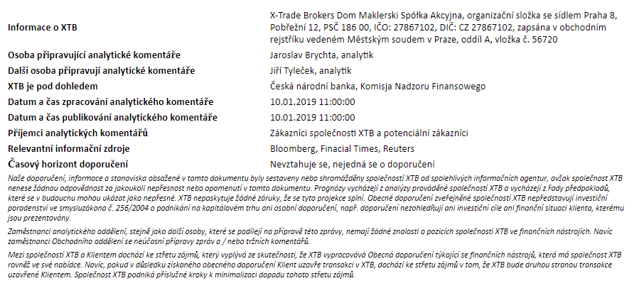 Tento materiál je marketingovou komunikáciou v zmysle čl. 24 ods. 3 smernice Európskeho parlamentu a Rady 2014/65/EÚ z 15. mája 2014 o trhoch s finančnými nástrojmi, ktorou sa mení smernica 2002/92/ES a smernica 2011/61/EÚ (MiFID II). Marketingová komunikácia nie je investičným odporúčaním ani informáciou odporúčajúcou alebo navrhujúcou investičnú stratégiu v zmysle nariadenia Európskeho parlamentu a Rady (EÚ) č. 596/2014 zo 16. apríla 2014 o zneužívaní trhu (nariadenie o zneužívaní trhu) a o zrušení smernice Európskeho parlamentu a Rady 2003/6/ES a smerníc Komisie 2003/124/ES, 2003/125/ES a 2004/72/ES a delegovaného nariadenia Komisie (EÚ) 2016/958 z 9. marca 2016, ktorým sa dopĺňa nariadenie Európskeho parlamentu a Rady (EÚ) č. 596/2014, pokiaľ ide o regulačné technické predpisy upravujúce technické opatrenia na objektívnu prezentáciu investičných odporúčaní alebo iných informácií, ktorými sa odporúča alebo navrhuje investičná stratégia, a na zverejňovanie osobitných záujmov alebo uvádzanie konfliktov záujmov v zmysle zákona č. 566/2001 Z. z. o cenných papieroch a investičných službách. Marketingová komunikácia je pripravená s najvyššou starostlivosťou, objektivitou, prezentuje fakty známe autorovi k dátumu prípravy a neobsahuje žiadne hodnotiace prvky. Marketingová komunikácia je pripravená bez zohľadnenia potrieb klienta, jeho individuálnej finančnej situácie a nijakým spôsobom nepredstavuje investičnú stratégiu. Marketingová komunikácia nepredstavuje ponuku na predaj, ponuku, predplatné, výzvu na nákup, reklamu alebo propagáciu akýchkoľvek finančných nástrojov. XTB S.A. organizačná zložka nezodpovedá za žiadne kroky alebo opomenutia klienta, najmä za nadobudnutie alebo predaj finančných nástrojov. XTB nezodpovedá za žiadnu stratu alebo škodu, vrátane, bez obmedzenia, akejkoľvek straty, ktorá môže vzniknúť priamo alebo nepriamo, spôsobená na základe informácií obsiahnutých v tejto marketingovej komunikácii. V prípade, že marketingová komunikácia obsahuje akékoľvek informácie o akýchkoľvek výsledkoch týkajúcich sa finančných nástrojov v nej uvedených, nepredstavujú žiadnu záruku ani prognózu budúcich výsledkov. Minulá výkonnosť nemusí nevyhnutne naznačovať budúce výsledky a každá osoba konajúca na základe týchto informácií tak robí výlučne na vlastné riziko.
