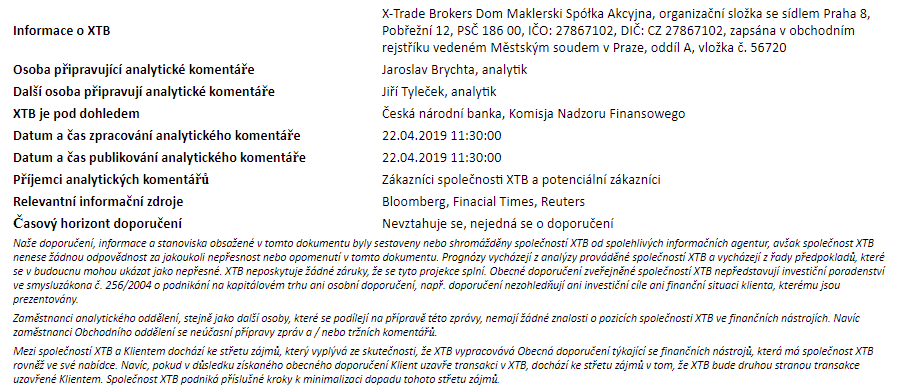 Tento materiál je marketingovou komunikáciou v zmysle čl. 24 ods. 3 smernice Európskeho parlamentu a Rady 2014/65/EÚ z 15. mája 2014 o trhoch s finančnými nástrojmi, ktorou sa mení smernica 2002/92/ES a smernica 2011/61/EÚ (MiFID II). Marketingová komunikácia nie je investičným odporúčaním ani informáciou odporúčajúcou alebo navrhujúcou investičnú stratégiu v zmysle nariadenia Európskeho parlamentu a Rady (EÚ) č. 596/2014 zo 16. apríla 2014 o zneužívaní trhu (nariadenie o zneužívaní trhu) a o zrušení smernice Európskeho parlamentu a Rady 2003/6/ES a smerníc Komisie 2003/124/ES, 2003/125/ES a 2004/72/ES a delegovaného nariadenia Komisie (EÚ) 2016/958 z 9. marca 2016, ktorým sa dopĺňa nariadenie Európskeho parlamentu a Rady (EÚ) č. 596/2014, pokiaľ ide o regulačné technické predpisy upravujúce technické opatrenia na objektívnu prezentáciu investičných odporúčaní alebo iných informácií, ktorými sa odporúča alebo navrhuje investičná stratégia, a na zverejňovanie osobitných záujmov alebo uvádzanie konfliktov záujmov v zmysle zákona č. 566/2001 Z. z. o cenných papieroch a investičných službách. Marketingová komunikácia je pripravená s najvyššou starostlivosťou, objektivitou, prezentuje fakty známe autorovi k dátumu prípravy a neobsahuje žiadne hodnotiace prvky. Marketingová komunikácia je pripravená bez zohľadnenia potrieb klienta, jeho individuálnej finančnej situácie a nijakým spôsobom nepredstavuje investičnú stratégiu. Marketingová komunikácia nepredstavuje ponuku na predaj, ponuku, predplatné, výzvu na nákup, reklamu alebo propagáciu akýchkoľvek finančných nástrojov. XTB S.A. organizačná zložka nezodpovedá za žiadne kroky alebo opomenutia klienta, najmä za nadobudnutie alebo predaj finančných nástrojov. XTB nezodpovedá za žiadnu stratu alebo škodu, vrátane, bez obmedzenia, akejkoľvek straty, ktorá môže vzniknúť priamo alebo nepriamo, spôsobená na základe informácií obsiahnutých v tejto marketingovej komunikácii. V prípade, že marketingová komunikácia obsahuje akékoľvek informácie o akýchkoľvek výsledkoch týkajúcich sa finančných nástrojov v nej uvedených, nepredstavujú žiadnu záruku ani prognózu budúcich výsledkov. Minulá výkonnosť nemusí nevyhnutne naznačovať budúce výsledky a každá osoba konajúca na základe týchto informácií tak robí výlučne na vlastné riziko.