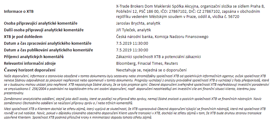 Tento materiál je marketingovou komunikáciou v zmysle čl. 24 ods. 3 smernice Európskeho parlamentu a Rady 2014/65/EÚ z 15. mája 2014 o trhoch s finančnými nástrojmi, ktorou sa mení smernica 2002/92/ES a smernica 2011/61/EÚ (MiFID II). Marketingová komunikácia nie je investičným odporúčaním ani informáciou odporúčajúcou alebo navrhujúcou investičnú stratégiu v zmysle nariadenia Európskeho parlamentu a Rady (EÚ) č. 596/2014 zo 16. apríla 2014 o zneužívaní trhu (nariadenie o zneužívaní trhu) a o zrušení smernice Európskeho parlamentu a Rady 2003/6/ES a smerníc Komisie 2003/124/ES, 2003/125/ES a 2004/72/ES a delegovaného nariadenia Komisie (EÚ) 2016/958 z 9. marca 2016, ktorým sa dopĺňa nariadenie Európskeho parlamentu a Rady (EÚ) č. 596/2014, pokiaľ ide o regulačné technické predpisy upravujúce technické opatrenia na objektívnu prezentáciu investičných odporúčaní alebo iných informácií, ktorými sa odporúča alebo navrhuje investičná stratégia, a na zverejňovanie osobitných záujmov alebo uvádzanie konfliktov záujmov v zmysle zákona č. 566/2001 Z. z. o cenných papieroch a investičných službách. Marketingová komunikácia je pripravená s najvyššou starostlivosťou, objektivitou, prezentuje fakty známe autorovi k dátumu prípravy a neobsahuje žiadne hodnotiace prvky. Marketingová komunikácia je pripravená bez zohľadnenia potrieb klienta, jeho individuálnej finančnej situácie a nijakým spôsobom nepredstavuje investičnú stratégiu. Marketingová komunikácia nepredstavuje ponuku na predaj, ponuku, predplatné, výzvu na nákup, reklamu alebo propagáciu akýchkoľvek finančných nástrojov. XTB S.A. organizačná zložka nezodpovedá za žiadne kroky alebo opomenutia klienta, najmä za nadobudnutie alebo predaj finančných nástrojov. XTB nezodpovedá za žiadnu stratu alebo škodu, vrátane, bez obmedzenia, akejkoľvek straty, ktorá môže vzniknúť priamo alebo nepriamo, spôsobená na základe informácií obsiahnutých v tejto marketingovej komunikácii. V prípade, že marketingová komunikácia obsahuje akékoľvek informácie o akýchkoľvek výsledkoch týkajúcich sa finančných nástrojov v nej uvedených, nepredstavujú žiadnu záruku ani prognózu budúcich výsledkov. Minulá výkonnosť nemusí nevyhnutne naznačovať budúce výsledky a každá osoba konajúca na základe týchto informácií tak robí výlučne na vlastné riziko.