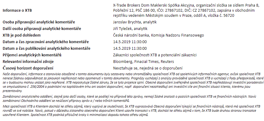 Tento materiál je marketingovou komunikáciou v zmysle čl. 24 ods. 3 smernice Európskeho parlamentu a Rady 2014/65/EÚ z 15. mája 2014 o trhoch s finančnými nástrojmi, ktorou sa mení smernica 2002/92/ES a smernica 2011/61/EÚ (MiFID II). Marketingová komunikácia nie je investičným odporúčaním ani informáciou odporúčajúcou alebo navrhujúcou investičnú stratégiu v zmysle nariadenia Európskeho parlamentu a Rady (EÚ) č. 596/2014 zo 16. apríla 2014 o zneužívaní trhu (nariadenie o zneužívaní trhu) a o zrušení smernice Európskeho parlamentu a Rady 2003/6/ES a smerníc Komisie 2003/124/ES, 2003/125/ES a 2004/72/ES a delegovaného nariadenia Komisie (EÚ) 2016/958 z 9. marca 2016, ktorým sa dopĺňa nariadenie Európskeho parlamentu a Rady (EÚ) č. 596/2014, pokiaľ ide o regulačné technické predpisy upravujúce technické opatrenia na objektívnu prezentáciu investičných odporúčaní alebo iných informácií, ktorými sa odporúča alebo navrhuje investičná stratégia, a na zverejňovanie osobitných záujmov alebo uvádzanie konfliktov záujmov v zmysle zákona č. 566/2001 Z. z. o cenných papieroch a investičných službách. Marketingová komunikácia je pripravená s najvyššou starostlivosťou, objektivitou, prezentuje fakty známe autorovi k dátumu prípravy a neobsahuje žiadne hodnotiace prvky. Marketingová komunikácia je pripravená bez zohľadnenia potrieb klienta, jeho individuálnej finančnej situácie a nijakým spôsobom nepredstavuje investičnú stratégiu. Marketingová komunikácia nepredstavuje ponuku na predaj, ponuku, predplatné, výzvu na nákup, reklamu alebo propagáciu akýchkoľvek finančných nástrojov. XTB S.A. organizačná zložka nezodpovedá za žiadne kroky alebo opomenutia klienta, najmä za nadobudnutie alebo predaj finančných nástrojov. XTB nezodpovedá za žiadnu stratu alebo škodu, vrátane, bez obmedzenia, akejkoľvek straty, ktorá môže vzniknúť priamo alebo nepriamo, spôsobená na základe informácií obsiahnutých v tejto marketingovej komunikácii. V prípade, že marketingová komunikácia obsahuje akékoľvek informácie o akýchkoľvek výsledkoch týkajúcich sa finančných nástrojov v nej uvedených, nepredstavujú žiadnu záruku ani prognózu budúcich výsledkov. Minulá výkonnosť nemusí nevyhnutne naznačovať budúce výsledky a každá osoba konajúca na základe týchto informácií tak robí výlučne na vlastné riziko.