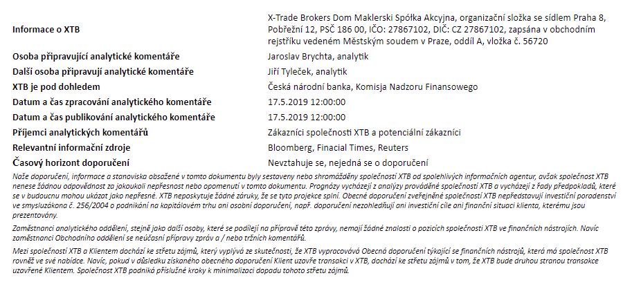 Tento materiál je marketingovou komunikáciou v zmysle čl. 24 ods. 3 smernice Európskeho parlamentu a Rady 2014/65/EÚ z 15. mája 2014 o trhoch s finančnými nástrojmi, ktorou sa mení smernica 2002/92/ES a smernica 2011/61/EÚ (MiFID II). Marketingová komunikácia nie je investičným odporúčaním ani informáciou odporúčajúcou alebo navrhujúcou investičnú stratégiu v zmysle nariadenia Európskeho parlamentu a Rady (EÚ) č. 596/2014 zo 16. apríla 2014 o zneužívaní trhu (nariadenie o zneužívaní trhu) a o zrušení smernice Európskeho parlamentu a Rady 2003/6/ES a smerníc Komisie 2003/124/ES, 2003/125/ES a 2004/72/ES a delegovaného nariadenia Komisie (EÚ) 2016/958 z 9. marca 2016, ktorým sa dopĺňa nariadenie Európskeho parlamentu a Rady (EÚ) č. 596/2014, pokiaľ ide o regulačné technické predpisy upravujúce technické opatrenia na objektívnu prezentáciu investičných odporúčaní alebo iných informácií, ktorými sa odporúča alebo navrhuje investičná stratégia, a na zverejňovanie osobitných záujmov alebo uvádzanie konfliktov záujmov v zmysle zákona č. 566/2001 Z. z. o cenných papieroch a investičných službách. Marketingová komunikácia je pripravená s najvyššou starostlivosťou, objektivitou, prezentuje fakty známe autorovi k dátumu prípravy a neobsahuje žiadne hodnotiace prvky. Marketingová komunikácia je pripravená bez zohľadnenia potrieb klienta, jeho individuálnej finančnej situácie a nijakým spôsobom nepredstavuje investičnú stratégiu. Marketingová komunikácia nepredstavuje ponuku na predaj, ponuku, predplatné, výzvu na nákup, reklamu alebo propagáciu akýchkoľvek finančných nástrojov. XTB S.A. organizačná zložka nezodpovedá za žiadne kroky alebo opomenutia klienta, najmä za nadobudnutie alebo predaj finančných nástrojov. XTB nezodpovedá za žiadnu stratu alebo škodu, vrátane, bez obmedzenia, akejkoľvek straty, ktorá môže vzniknúť priamo alebo nepriamo, spôsobená na základe informácií obsiahnutých v tejto marketingovej komunikácii. V prípade, že marketingová komunikácia obsahuje akékoľvek informácie o akýchkoľvek výsledkoch týkajúcich sa finančných nástrojov v nej uvedených, nepredstavujú žiadnu záruku ani prognózu budúcich výsledkov. Minulá výkonnosť nemusí nevyhnutne naznačovať budúce výsledky a každá osoba konajúca na základe týchto informácií tak robí výlučne na vlastné riziko.