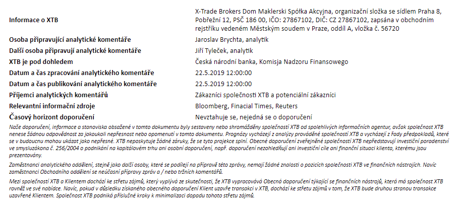Tento materiál je marketingovou komunikáciou v zmysle čl. 24 ods. 3 smernice Európskeho parlamentu a Rady 2014/65/EÚ z 15. mája 2014 o trhoch s finančnými nástrojmi, ktorou sa mení smernica 2002/92/ES a smernica 2011/61/EÚ (MiFID II). Marketingová komunikácia nie je investičným odporúčaním ani informáciou odporúčajúcou alebo navrhujúcou investičnú stratégiu v zmysle nariadenia Európskeho parlamentu a Rady (EÚ) č. 596/2014 zo 16. apríla 2014 o zneužívaní trhu (nariadenie o zneužívaní trhu) a o zrušení smernice Európskeho parlamentu a Rady 2003/6/ES a smerníc Komisie 2003/124/ES, 2003/125/ES a 2004/72/ES a delegovaného nariadenia Komisie (EÚ) 2016/958 z 9. marca 2016, ktorým sa dopĺňa nariadenie Európskeho parlamentu a Rady (EÚ) č. 596/2014, pokiaľ ide o regulačné technické predpisy upravujúce technické opatrenia na objektívnu prezentáciu investičných odporúčaní alebo iných informácií, ktorými sa odporúča alebo navrhuje investičná stratégia, a na zverejňovanie osobitných záujmov alebo uvádzanie konfliktov záujmov v zmysle zákona č. 566/2001 Z. z. o cenných papieroch a investičných službách. Marketingová komunikácia je pripravená s najvyššou starostlivosťou, objektivitou, prezentuje fakty známe autorovi k dátumu prípravy a neobsahuje žiadne hodnotiace prvky. Marketingová komunikácia je pripravená bez zohľadnenia potrieb klienta, jeho individuálnej finančnej situácie a nijakým spôsobom nepredstavuje investičnú stratégiu. Marketingová komunikácia nepredstavuje ponuku na predaj, ponuku, predplatné, výzvu na nákup, reklamu alebo propagáciu akýchkoľvek finančných nástrojov. XTB S.A. organizačná zložka nezodpovedá za žiadne kroky alebo opomenutia klienta, najmä za nadobudnutie alebo predaj finančných nástrojov. XTB nezodpovedá za žiadnu stratu alebo škodu, vrátane, bez obmedzenia, akejkoľvek straty, ktorá môže vzniknúť priamo alebo nepriamo, spôsobená na základe informácií obsiahnutých v tejto marketingovej komunikácii. V prípade, že marketingová komunikácia obsahuje akékoľvek informácie o akýchkoľvek výsledkoch týkajúcich sa finančných nástrojov v nej uvedených, nepredstavujú žiadnu záruku ani prognózu budúcich výsledkov. Minulá výkonnosť nemusí nevyhnutne naznačovať budúce výsledky a každá osoba konajúca na základe týchto informácií tak robí výlučne na vlastné riziko.