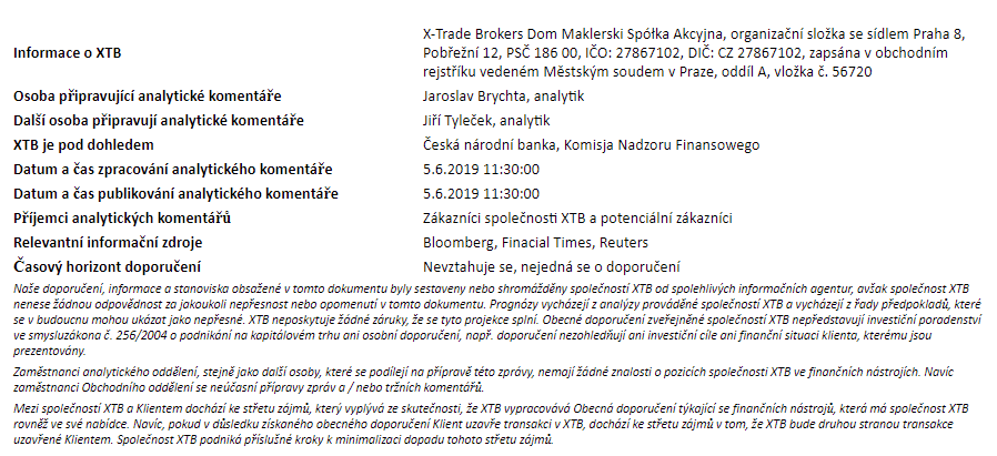 Tento materiál je marketingovou komunikáciou v zmysle čl. 24 ods. 3 smernice Európskeho parlamentu a Rady 2014/65/EÚ z 15. mája 2014 o trhoch s finančnými nástrojmi, ktorou sa mení smernica 2002/92/ES a smernica 2011/61/EÚ (MiFID II). Marketingová komunikácia nie je investičným odporúčaním ani informáciou odporúčajúcou alebo navrhujúcou investičnú stratégiu v zmysle nariadenia Európskeho parlamentu a Rady (EÚ) č. 596/2014 zo 16. apríla 2014 o zneužívaní trhu (nariadenie o zneužívaní trhu) a o zrušení smernice Európskeho parlamentu a Rady 2003/6/ES a smerníc Komisie 2003/124/ES, 2003/125/ES a 2004/72/ES a delegovaného nariadenia Komisie (EÚ) 2016/958 z 9. marca 2016, ktorým sa dopĺňa nariadenie Európskeho parlamentu a Rady (EÚ) č. 596/2014, pokiaľ ide o regulačné technické predpisy upravujúce technické opatrenia na objektívnu prezentáciu investičných odporúčaní alebo iných informácií, ktorými sa odporúča alebo navrhuje investičná stratégia, a na zverejňovanie osobitných záujmov alebo uvádzanie konfliktov záujmov v zmysle zákona č. 566/2001 Z. z. o cenných papieroch a investičných službách. Marketingová komunikácia je pripravená s najvyššou starostlivosťou, objektivitou, prezentuje fakty známe autorovi k dátumu prípravy a neobsahuje žiadne hodnotiace prvky. Marketingová komunikácia je pripravená bez zohľadnenia potrieb klienta, jeho individuálnej finančnej situácie a nijakým spôsobom nepredstavuje investičnú stratégiu. Marketingová komunikácia nepredstavuje ponuku na predaj, ponuku, predplatné, výzvu na nákup, reklamu alebo propagáciu akýchkoľvek finančných nástrojov. XTB S.A. organizačná zložka nezodpovedá za žiadne kroky alebo opomenutia klienta, najmä za nadobudnutie alebo predaj finančných nástrojov. XTB nezodpovedá za žiadnu stratu alebo škodu, vrátane, bez obmedzenia, akejkoľvek straty, ktorá môže vzniknúť priamo alebo nepriamo, spôsobená na základe informácií obsiahnutých v tejto marketingovej komunikácii. V prípade, že marketingová komunikácia obsahuje akékoľvek informácie o akýchkoľvek výsledkoch týkajúcich sa finančných nástrojov v nej uvedených, nepredstavujú žiadnu záruku ani prognózu budúcich výsledkov. Minulá výkonnosť nemusí nevyhnutne naznačovať budúce výsledky a každá osoba konajúca na základe týchto informácií tak robí výlučne na vlastné riziko.