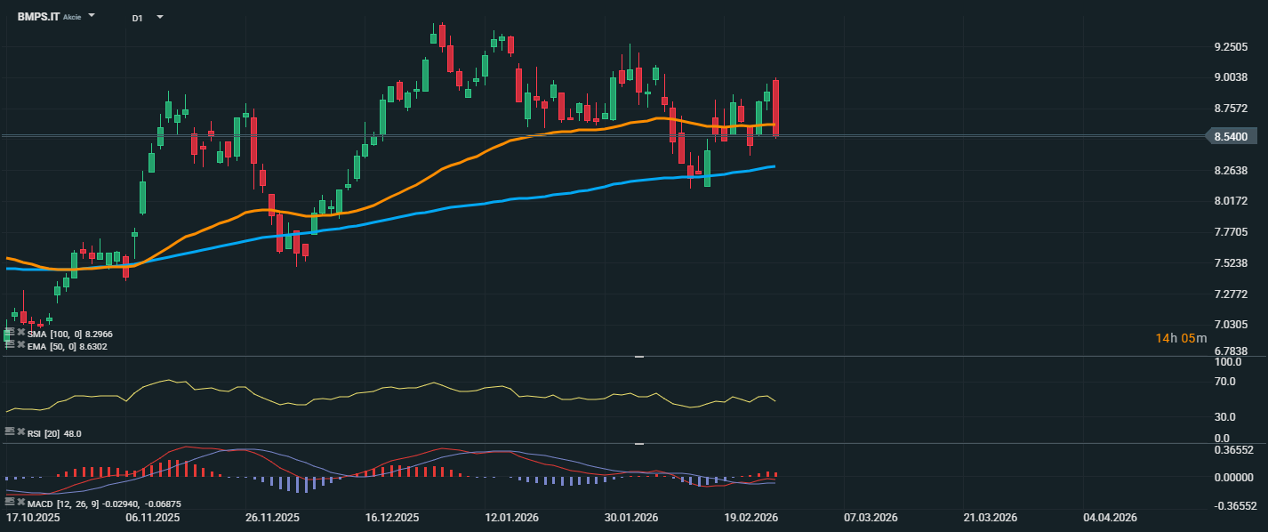 Akcie spoločnosti Banca Monte dei Paschi di Siena SpA sa obchodujú za približne 8,54 EUR a v súčasnosti testujú dôležitú technickú úroveň. Cena je tesne pod kĺzavým priemerom EMA 50 (8,63 EUR), zatiaľ čo SMA 100 (8,30 EUR) zostáva nižšia a v súčasnosti poskytuje strednodobú podporu. Po predchádzajúcom raste nad 9,40 EUR došlo k postupnej korekcii a trh sa teraz vracia do konsolidačného rozpätia medzi 8,50 EUR a 9,00 EUR. Úroveň 8,50 EUR predstavuje krátkodobú podporu, ktorej udržanie bude kľúčové pre zachovanie pozitívnej štruktúry. RSI sa pohybuje tesne pod neutrálnou úrovňou 50, čo signalizuje vyvážený pomer síl bez výraznej prevahy kupujúcich.