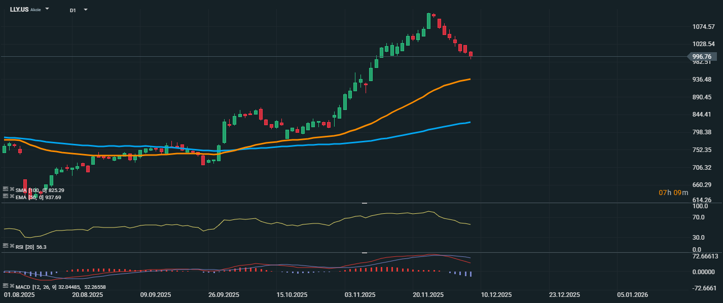 Akcie spoločnosti Eli Lilly sa po výraznom rastovom období nachádzajú v korekcii, aktuálne sa obchodujú na úrovni 996,76 USD. Po dosiahnutí vrcholu v blízkosti 1 070 USD došlo ku krátkodobému obratu trendu, ktorý však zatiaľ nenarušuje dlhodobé býčie nastavenie. Cena akcií sa stále nachádza výrazne nad oboma kĺzavými priemermi – EMA 50 (937,69 USD) a SMA 100 (825,29 USD), čo značí, že hlavný trend zostáva rastový. Aktuálny pokles možno preto vnímať ako zdravú korekciu po predchádzajúcom prudkom raste. RSI osciluje na hodnote 56,3, teda v neutrálnom pásme, bez známok prepredanosti či prekúpenosti.