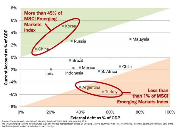 Zatiaľ to vyzerá na veľmi obmedzený dopad. Po prvé z toho dôvodu, že Argentína a Turecko nie sú v spektre emerging markets poprednými ekonomikami. Ich podiel na akciovom indexe MSCI Emerging Markets je menej ako 1%. Naopak, Čína s Kóreou, ktoré sú spomedzi EM krajín najmenej zraniteľné čo sa týka bežného účtu platobnej bilancie a externého dlhu, majú na ňom podiel viac ako 45%.