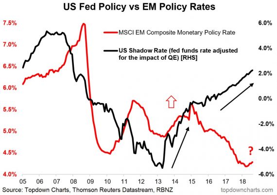 Vývoj úrokových sadzieb FEDu (po úprave o QE) a úrokových sadzieb EM (@topdowncharts):